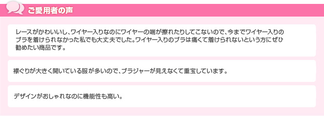 アンダー部全周にヘム生地を使い、締め付け感を軽減。くい込みにくく、アウターにもひびきにくい設計です。ワイヤーの肌側はフラットで、また前中心を低めに設定していますので、肌あたりが優しく、襟開きの深いアウターでも安心。
