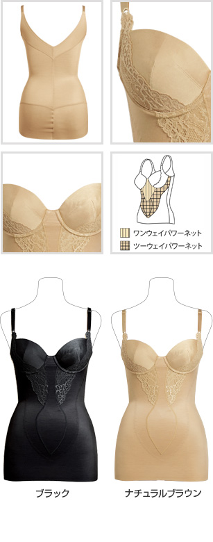 バストからお腹、胃のまわり、脇下、背中までを1枚で整えるボディーシェーパーです。バストは自然な丸みに、お腹まわりは2重使いのパワーネットでシェイプ。背中はVラインで気になる段差もすっきり!
