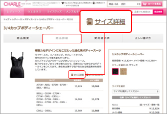 「商品詳細」タブの中の「サイズ詳細」リンクをクリックするとサイズ詳細画面が開きます。サイズは、ブラジャーサイズを基準にヒップサイズ別にお選びください。