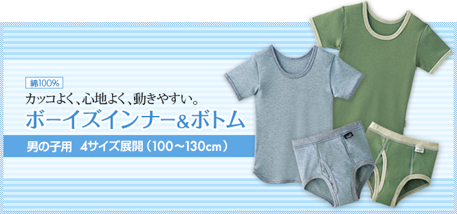 今回は男の子向けに、スポーティーなデザインとカラーがカッコいい、半袖インナーとボトム(ブリーフ)の上下セット(100〜130cm)のモニター10名様を募集します。