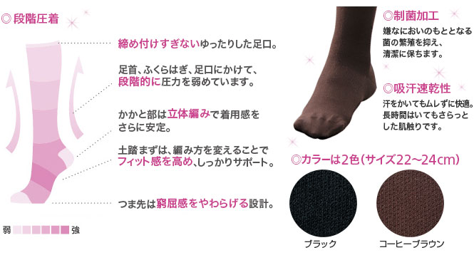 足先からふくらはぎまでを部位に合わせて段階的に着圧し、足をサポートするウエルネスハイソックスです。 足口は締め付けすぎず着脱しやすい、ゆったりとしたソフトパワー。 綿混素材なので肌にやさしく、吸汗速乾糸使用・制菌加工で、気になるムレやにおいも安心。 レビュー数 : 118 |