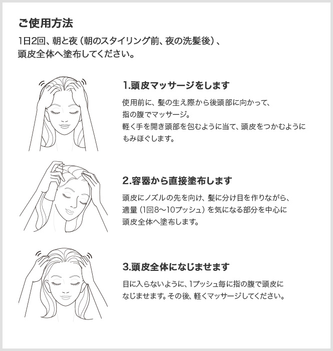 使用前に頭皮マッサージをしていただくことにより、頭皮の血行が促進され、本製品の効果をより高めることが期待できます。
