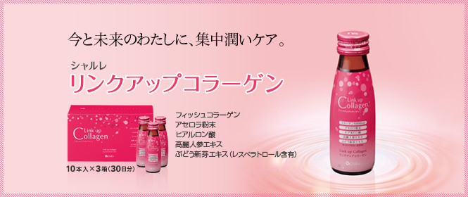 シャルレのリンクアップコラーゲンは、女性にうれしい5つの美容成分を厳選し、絶妙なバランスで配合した潤いケアドリンクです。1本に、1日に補うと良いといわれているコラーゲン量5000mgを含んでいます。飲みやすいぶどう味で、1本23kcal。手軽に美味しく続けていただけます。 実感できるから続けたくなる。そんな美容習慣を目指しました。