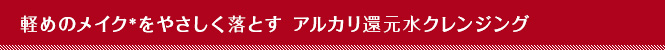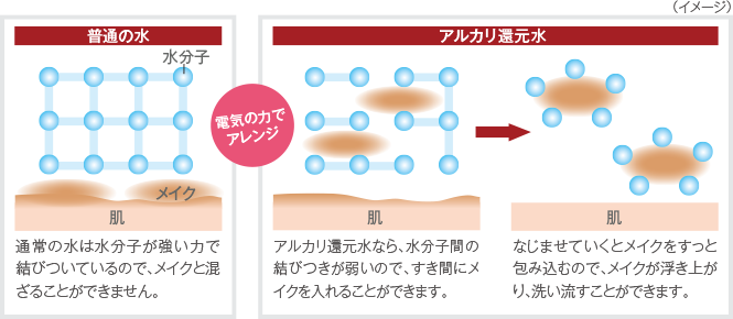 電気の力でアレンジしたアルカリ還元水は、水分子同士の結びつきが弱いため、クレンジングと同じように、メイクなどの油分を包み込んで落とします。また、アルカリ性の水にはせっけんのような作用もあり皮脂汚れを浮かせて落とすのでクレンジング後の洗顔の必要がなく、朝の洗顔料としてもお使いいただけます。