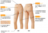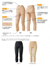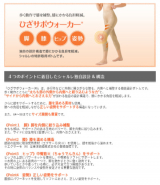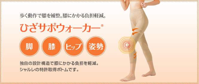 「ひざサポウォーカー(R)」は、歩行時などに外側に開きがちな膝を、内側へと補整する機能設計ボトムです。歩く動作とともに“太もも部の外側から内側へと絞り込むような力”と、“サイドから内側へとおさえる力”が加わる独自の設計構造で、膝にかかる負担を軽減します。
