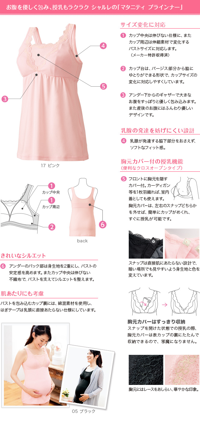 下着の着心地と品質にこだわるシャルレは、産前・産後の身体と赤ちゃんのために、マタニティ用品の老舗・犬印本舗とともに「シャルレマタニティ」シリーズを開発しました。「シャルレマタニティ ブラインナー」は、大きなお腹をしっかりと包み、出産後の授乳もラクラクのインナー。お腹やバストの変化にも対応し、乳腺の発達を妨げにくく、また授乳時にも便利な設計です。使い心地と着心地の良さで、マタニティ&授乳期間を快適に!