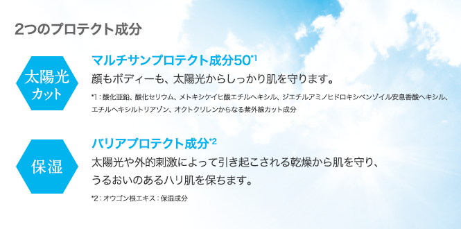 汗や水に強く顔もボディーも太陽光からしっかり守る日やけ止め乳液です。