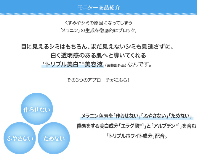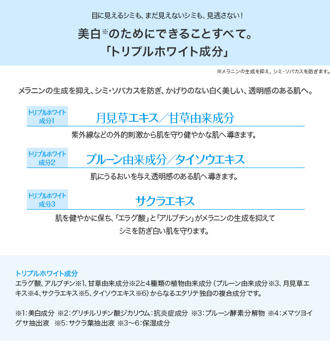 「エタリテ トリプル ホワイトニング フォースN<美白美容液>」(医薬部外品)でくすみやシミの原因になってしまう 「メラニン」の生成を徹底的にブロック。目に見えるシミはもちろん、まだ見えないシミも見逃さずに、 白く透明感のある肌へと導いてくれる “トリプル美白”※美容液です。