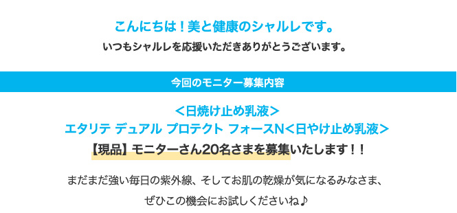 今回は「エタリテ デュアル プロテクト フォースN<日やけ止め乳液>」のモニター20名さまを募集いたします。