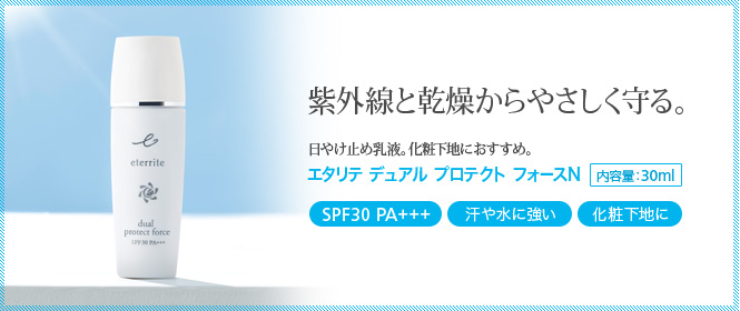 シャルレの日やけ止め乳液「エタリテ デュアル プロテクト フォースN<日やけ止め乳液>」は、リニューアルしてパワーアップ!SPF30・PA+++。紫外線(UV-A・UV-B)と乾燥から、日中の肌をやさしく守るために。さらっとなじんで肌表面をなめらかに整えながら、明るくいきいきとしたうるおいのある肌を保つ日やけ止め乳液。ナチュラルな肌色で化粧下地としてお使いいただけます。