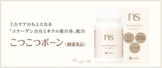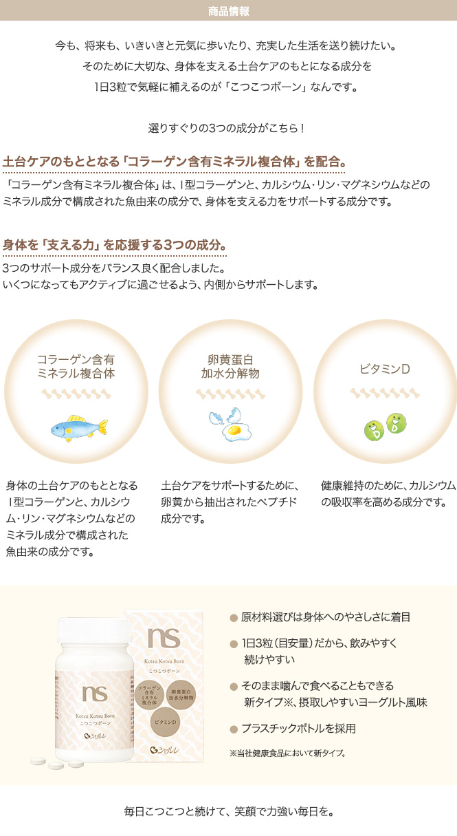 いきいきとした歩みや充実した生活を送り続けるために、土台ケアのもととなる成分を毎日続けて補うことが大切です。『こつこつボーン』には、「コラーゲン含有ミネラル複合体」という素材を配合しました。「コラーゲン含有ミネラル複合体」は、Ⅰ型コラーゲンと、カルシウム・リン・マグネシウムなどのミネラル成分で構成された魚由来の成分で、身体を支える力をサポートします。