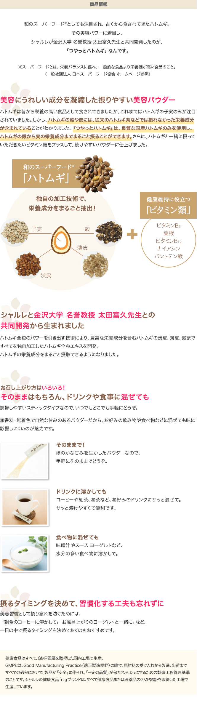 「ハトムギ」の美容パワーに着目し、シャルレが金沢大学 名誉教授 太田富久先生と共同開発した「つやっとハトムギ」。良質な国産ハトムギのみを使用し、ハトムギの殻から実の栄養成分までまるごと摂ることができる健康食品です。さらに、ハトムギと一緒に摂っていただきたいビタミン類をプラスして、続けやすいパウダーに仕上げました。今回はこの「つやっとハトムギ」のモニター20名さまを募集いたします。