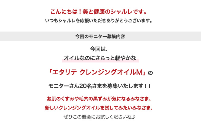 今回はこの「エタリテ クレンジングオイルM」のモニター20名さまを募集いたします。