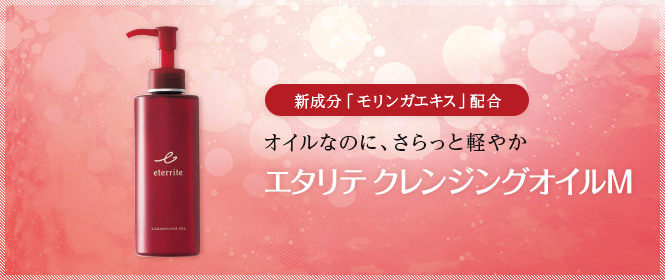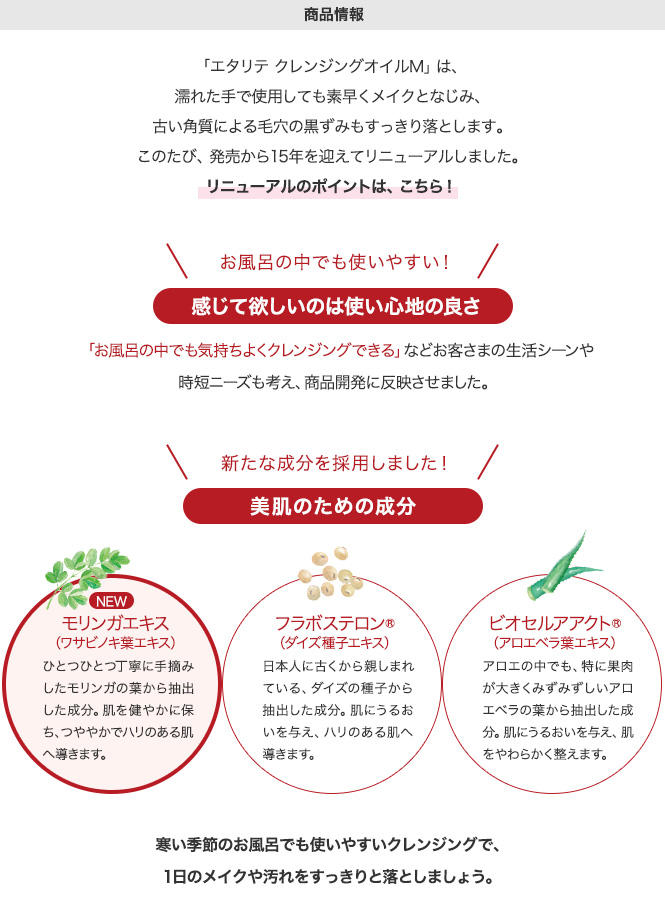 濡れた手で使用しても素早くメイクとなじみ、古い角質による毛穴の黒ずみもすっきり落とす「エタリテ クレンジングオイルM」。このたび、発売から15年を迎えてリニューアルしました。お風呂の中でも使いやすく、また美肌のための成分として「モリンガエキス(ワサビノキ葉エキス)」を配合しました。