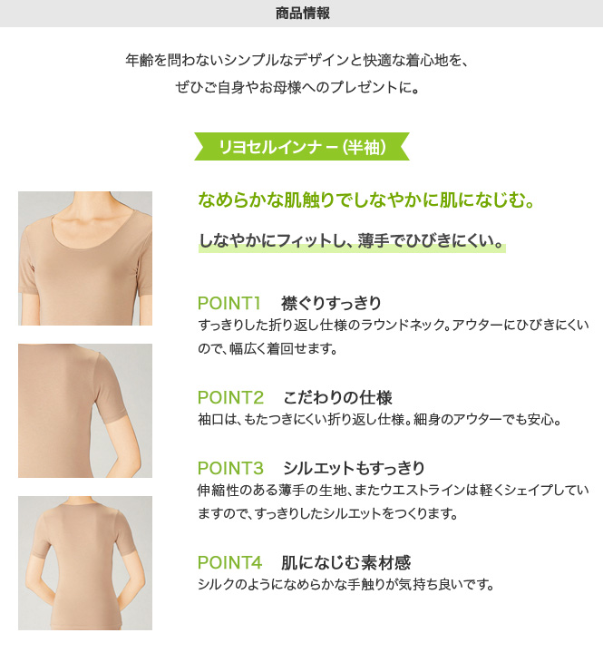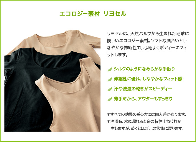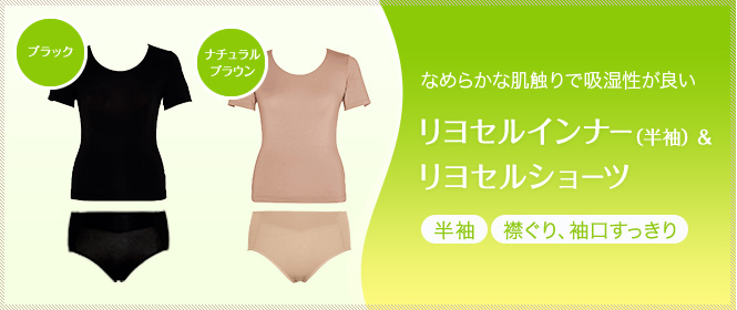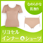 リヨセルは、天然パルプから生まれた地球に優しいエコロジー素材。ソフトな風合いとしなやかな伸縮性で、心地よくボディーにフィットします。今回はこの「リヨセルインナー(半袖)」と「リヨセルショーツ」をセットにして、モニター20名さまを募集いたします。