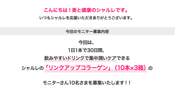 今回は「リンクアップコラーゲン」を30日間しっかりお試しいただけます。(1箱10本入り×3箱)