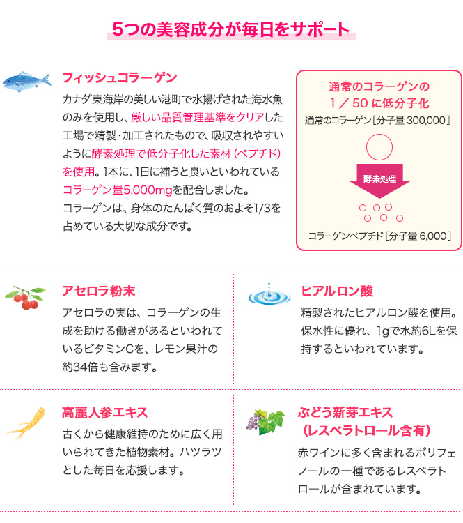 シャルレのリンクアップコラーゲンは、女性にうれしい5つの美容成分を厳選し、絶妙なバランスで配合した潤いケアドリンクです。1本に、1日に補うと良いといわれているコラーゲン量5000mgを含んでいます。飲みやすいぶどう味で、1本23kcal。手軽に美味しく続けていただけます。 実感できるから続けたくなる。そんな美容習慣を目指しました。 レビュー数 : 110 |