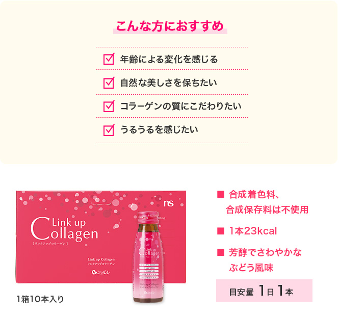 シャルレの「リンクアップコラーゲン」は、高品質なフィッシュコラーゲンなどをバランスよく配合し、若々しくハリのある毎日をサポートします。飲みやすいぶどう風味で、1本23kcal。