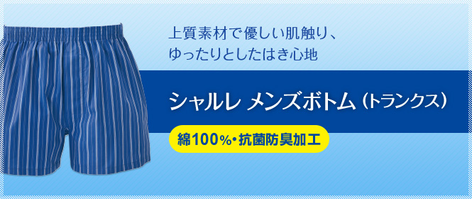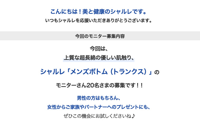 今回はこのシャルレ「メンズボトム(トランクス)」のモニター20名さまを募集いたします。