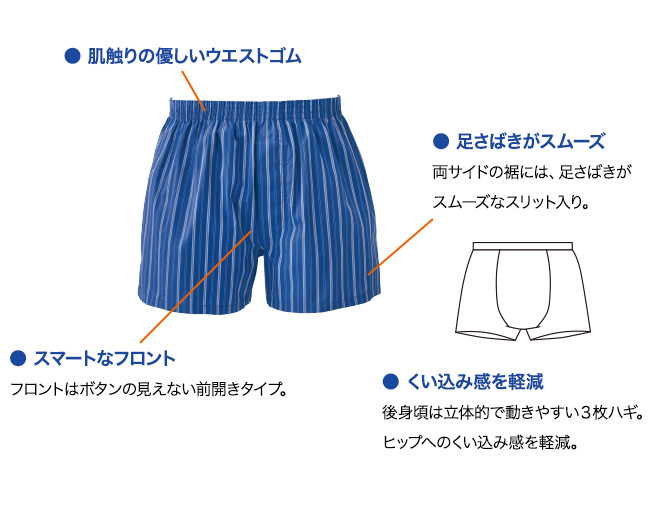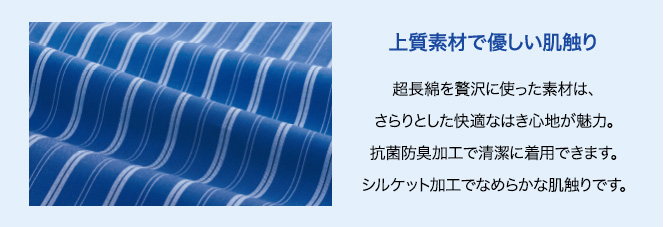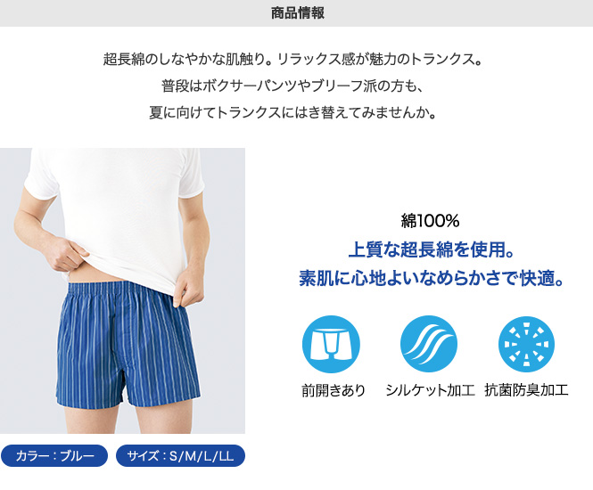 シンプルなストライプ柄で、リラックス感のあるトランクス。上質な超長綿を使用した優しい肌触り。抗菌防臭加工で清潔で爽やかな着用感です。