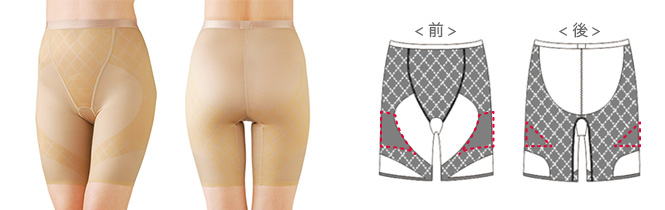 太ももを斜めに1周させる構造で、脇おさえの効果をより高めます。また、水平ではなく斜めにパワーをかけることで圧力が分散され、きつすぎない適度なパワー感を与え、段差を解消し、なめらかなラインに導きます。