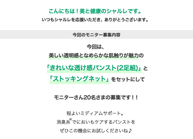 今回はこのシャルレ「きれいな透け感パンスト(2足組)&洗濯用ネット」のモニター20名さまを募集いたします。