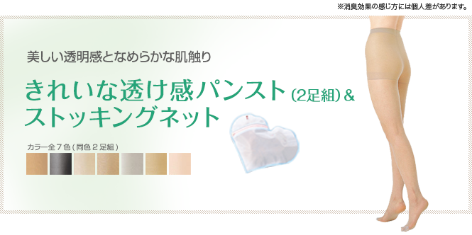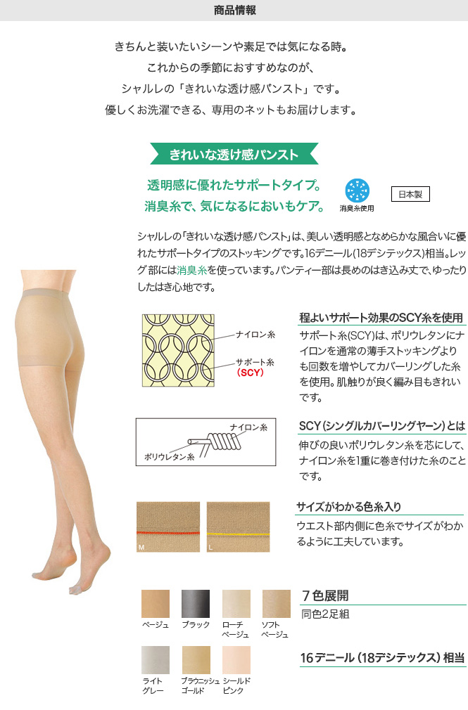 美しい透明感となめらかな風合いに優れたサポートタイプのストッキングは、16デニール(18デシテックス)相当。レッグ部には消臭糸を使っています。パンティー部は長めのはき込み丈で、ゆったりしたはき心地です。