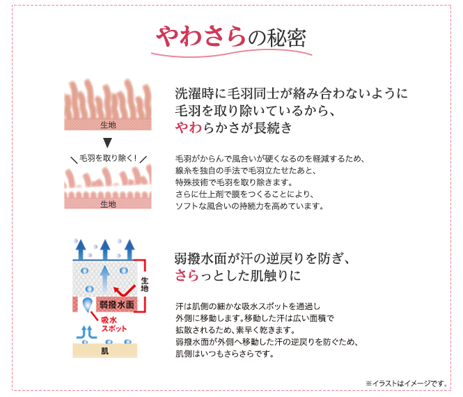 速乾機能をプラス。柔らかな風合いを長く感じることができ、