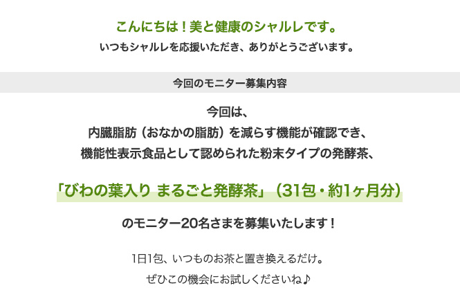 今回はこの「びわの葉入り まるごと発酵茶<機能性表示食品>」のモニター20名さまを募集いたします。