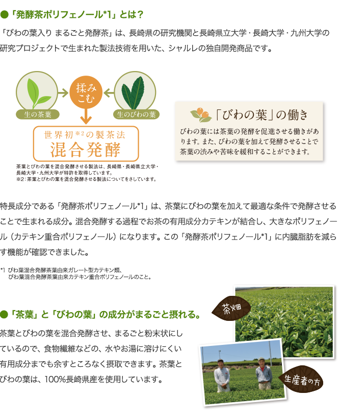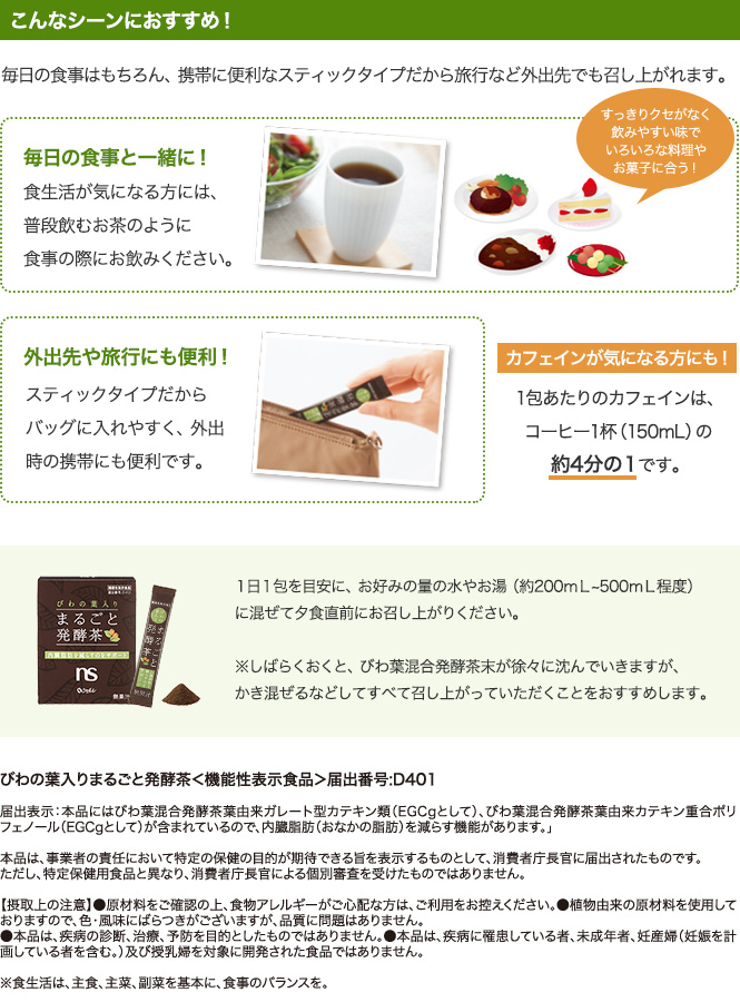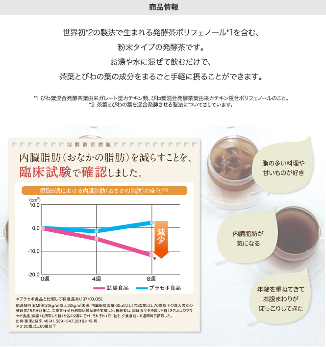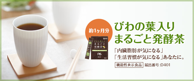 内臓脂肪(おなかの脂肪)を減らす機能が確認でき、機能性表示食品【届出番号:D401】として認められた粉末タイプの発酵茶、「びわの葉入り まるごと発酵茶」は、お湯や水に混ぜて飲むだけで茶葉とびわの葉の成分をまるごと手軽に飲むことができます。「内臓脂肪が気になる」「生活習慣が気になる」そんなあなたにおすすめです。