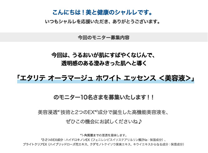 今回はこの「エタリテ オーラマージュ ホワイト エッセンス」のモニター10名さまを募集いたします。
