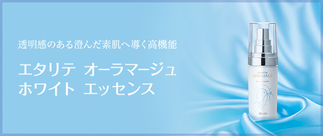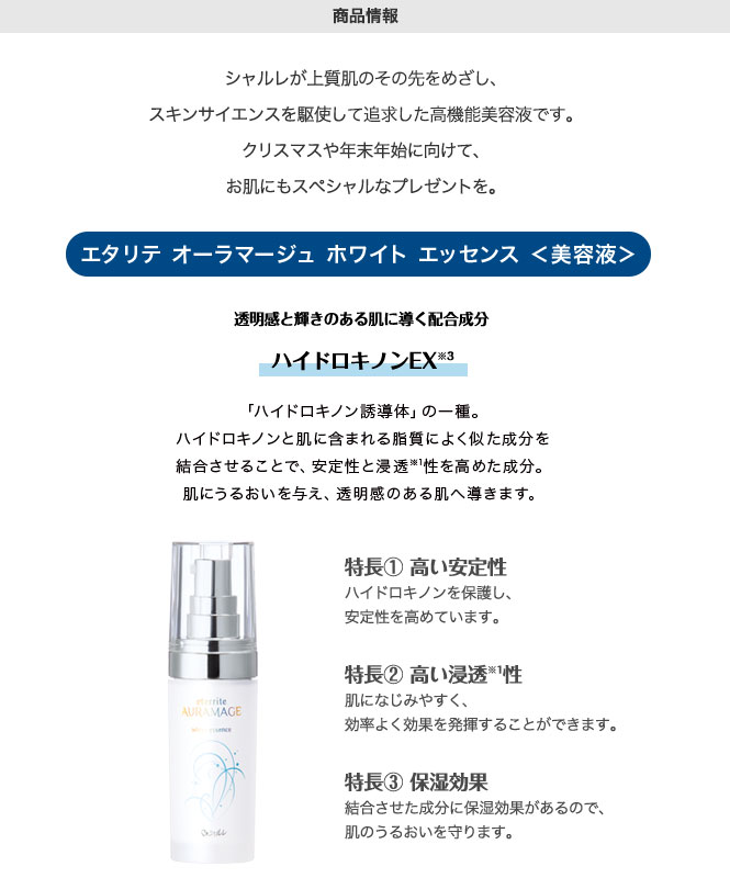 「エタリテ オーラマージュ ホワイト エッセンス <美容液>」は、シャルレの最高峰スキンケアシリーズの高機能美容液。スキンサイエンスを駆使して追求した独自開発成分が、肌にすばやくなじんで、角質層のすみずみにゆきわたるなめらかなうるおいが、透明感のある澄みきったあこがれの肌へと導きます。