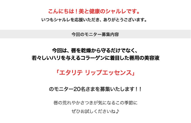 今回はこの「エタリテ リップエッセンス<唇用美容液>」のモニター20名さまを募集いたします。