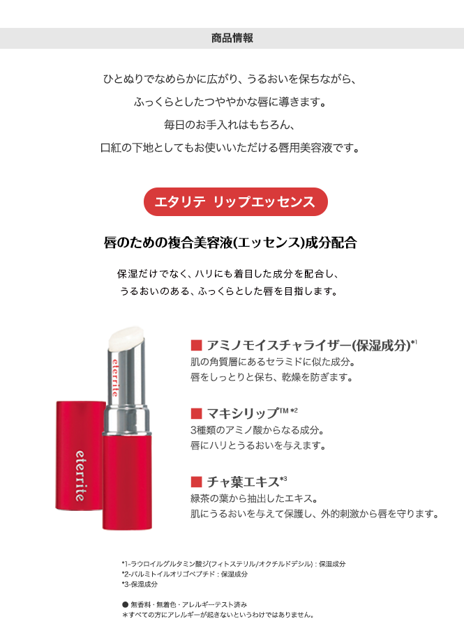 「エタリテ リップエッセンス<唇用美容液>」は、乾燥から守るだけでなく、若々しいハリを与えるコラーゲンに着目した唇用の美容液です。ひとぬりでなめらかに広がり、うるおいを保ちます。 レビュー数 : 86 |