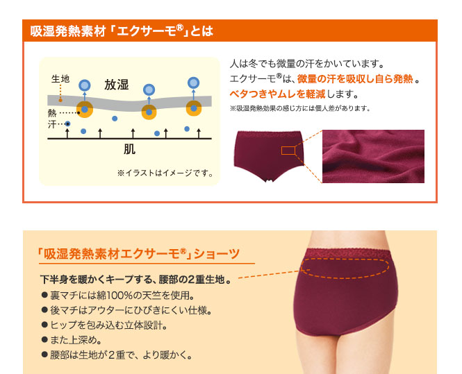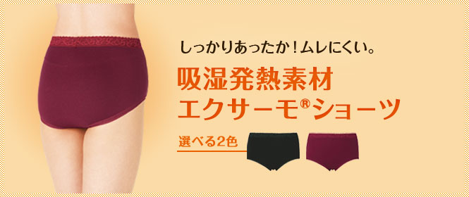 吸湿発熱素材の「エクサーモ(R)ショーツ」は、冬でもかく微量の汗を吸収して繊維自身が発熱するエクサーモ(R)を使用しています。ふんわり優しい肌触りでムレにくく、寒い日でも暖かく快適です。