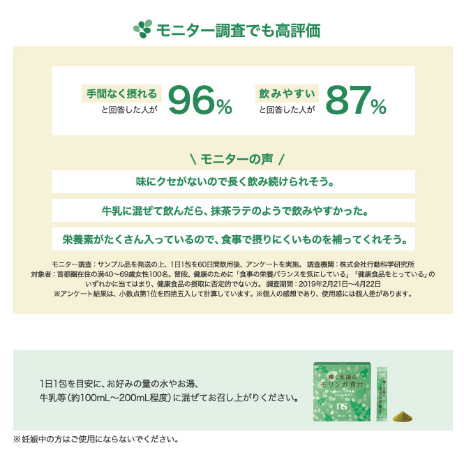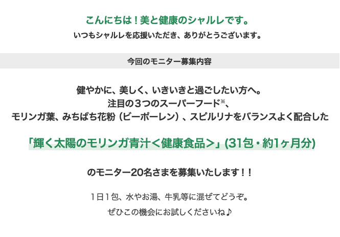 今回はこの「輝く太陽のモリンガ青汁<健康食品>」のモニター20名さまを募集いたします。