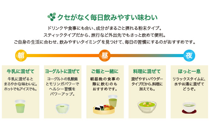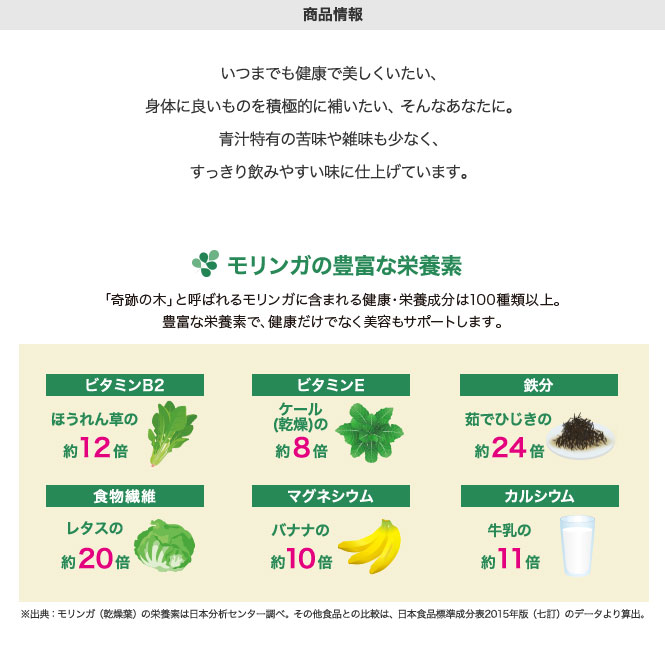 100種類以上の健康・栄養成分を含んだ、モリンガ葉とみつばち花粉(ビーポーレン)、スピルリナをバランスよく配合。青汁特有の苦味や雑味も少なく、すっきり飲みやすい味に仕上げています。健やかに、美しく、いきいきと過ごしたい方へ。理想の自分になるために、1日1包の新習慣を始めませんか。