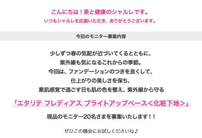 シャルレの「エタリテ フレディアス ブライトアップベース<化粧下地>」は、肌表面をなめらかに整え、ファンデーションの美しい仕上がりを保つ化粧下地です。素肌感覚で過ごす日も肌の色を整え、紫外線から守ります。今回はこの「エタリテ フレディアス ブライトアップベース<化粧下地>」のモニター20名さまを募集いたします。