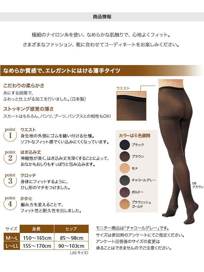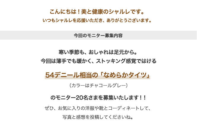 今回はこの「なめらかタイツ」(カラー:チャコールグレー)のモニター20名さまを募集いたします。