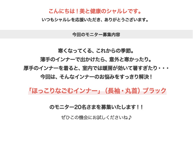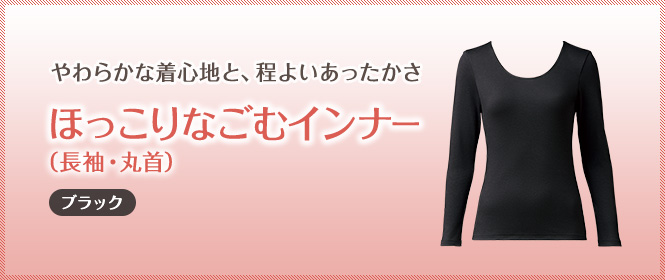 今回はこの「ほっこりなごむインナー(長袖・丸首)ブラック」のモニター20名さまを募集いたします。