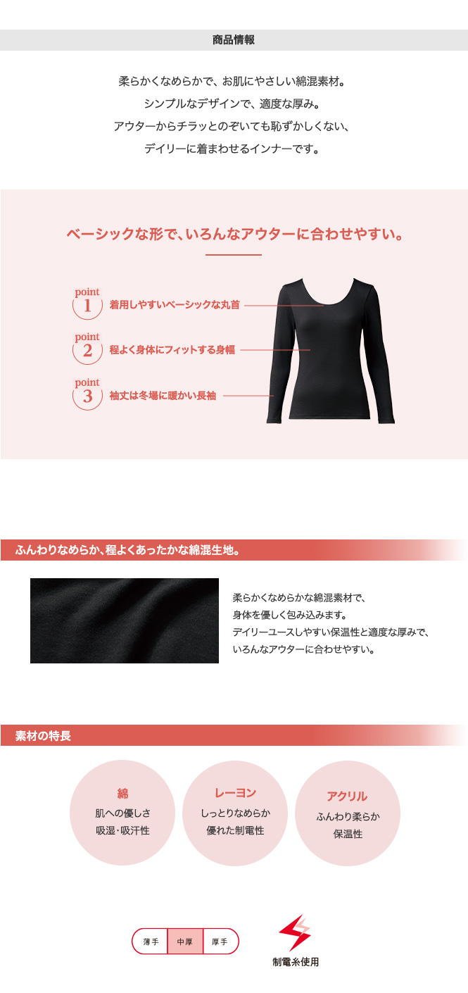 綿混素材でお肌に優しい。シンプルなデザインで、アウターからチラッとのぞいても恥ずかしくない、デイリーに着まわせるインナーです。秋冬の寒い・暑いにちょうど良い1枚で快適な1日を。