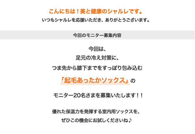 今回はこの「起毛あったかソックス」のモニター20名さまを募集いたします。
