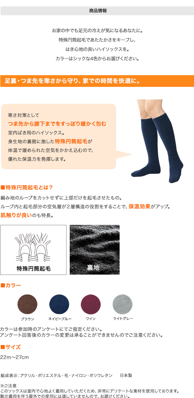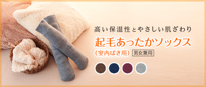 「起毛あったかソックス」。優れた保温性とやさしい肌触りで、はき心地の良いハイソックスです。特殊円筒起毛で暖かさをキープするので、お家の中でも足元の寒さが気になるあなたにおすすめです。