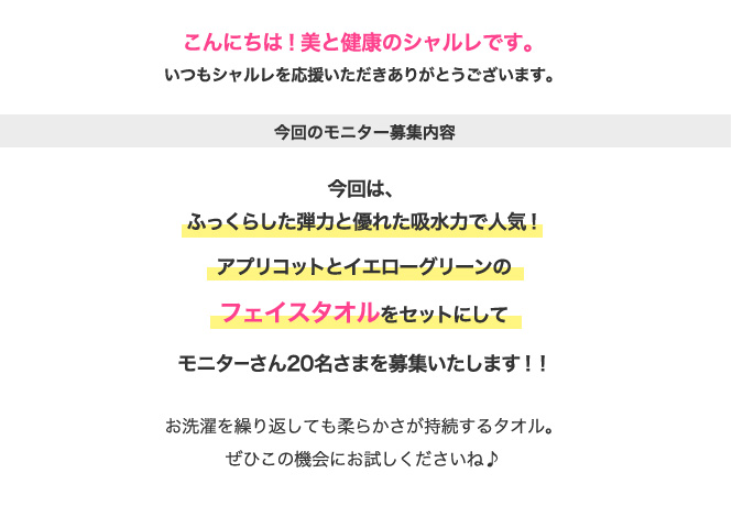 今回はこのシャルレのフェイスタオルをセットにして、モニター20名さまを募集いたします。