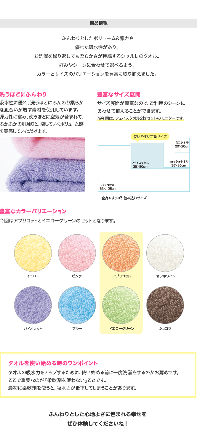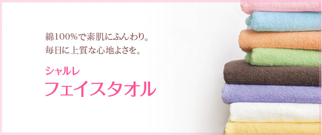 ふんわりとしたボリューム&弾力や優れた吸水性があり、お洗濯を繰り返しても柔らかさが持続するシャルレのタオル。カラーバリエーションも豊富で、お好みに合わせてお選びいただけます。
