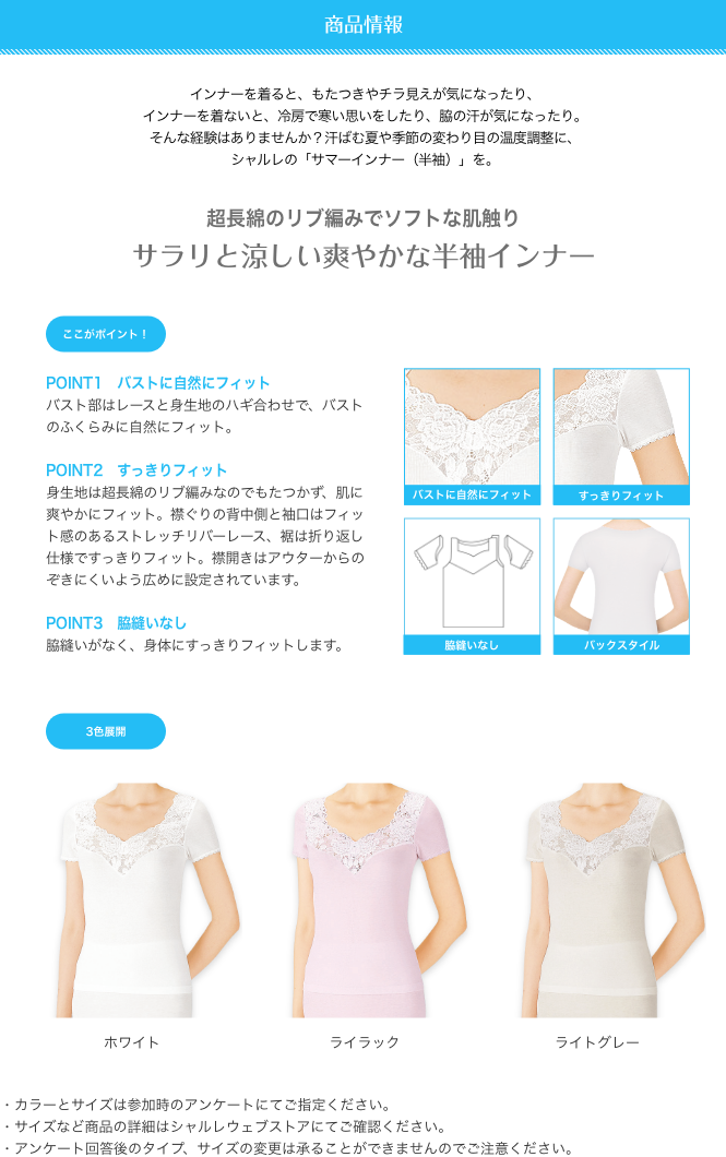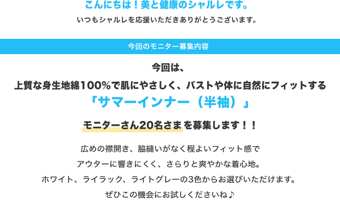 脇や背中の汗が気になる時期、季節の変わり目の温度調整対策には、インナーが活躍します。広めの襟開き、脇縫いがなく程よいフィット感でアウターに響きにくく、さらりと爽やかな着心地。今回はこのシャルレのサマーインナー(半袖)のモニター20名様を募集いたします。