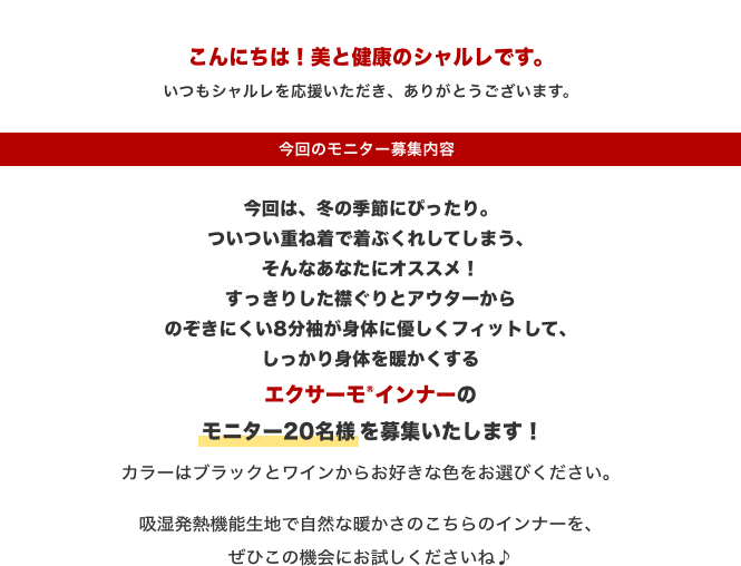 今回はエクサーモ(R)インナーのモニター20名さまを募集いたします。