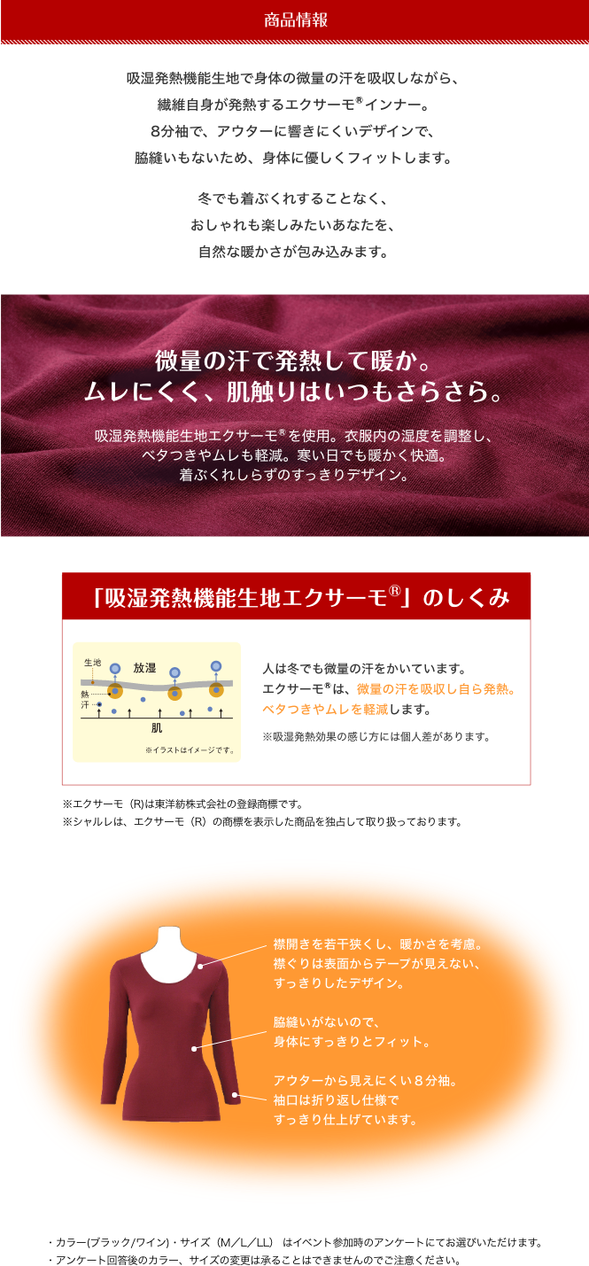 吸湿発熱機能生地で身体の微量の汗を吸収しながら、繊維自身が発熱するエクサーモ(R)インナー。8分袖で、アウターに響きにくいデザインで、冬でも着ぶくれすることなくおしゃれも楽しみたいあなたを、自然な暖かさが包み込みます。