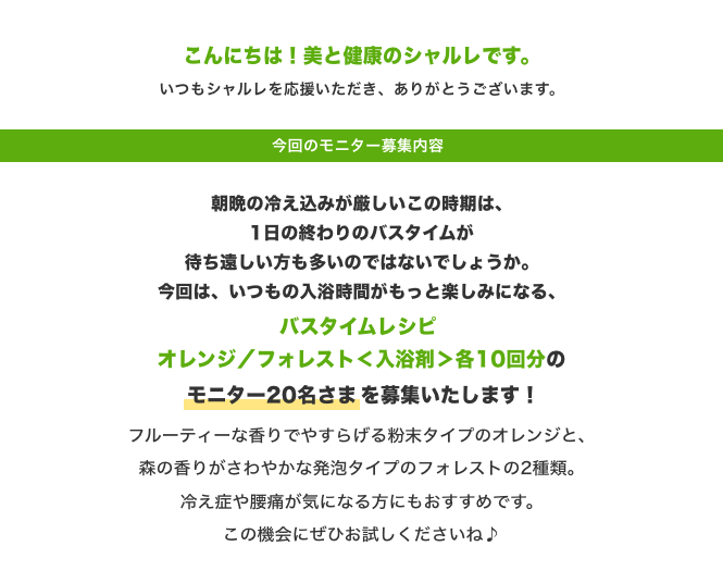 今回はバスタイムレシピ オレンジ/フォレスト<入浴剤>各10回分のモニター20名さまを募集いたします。