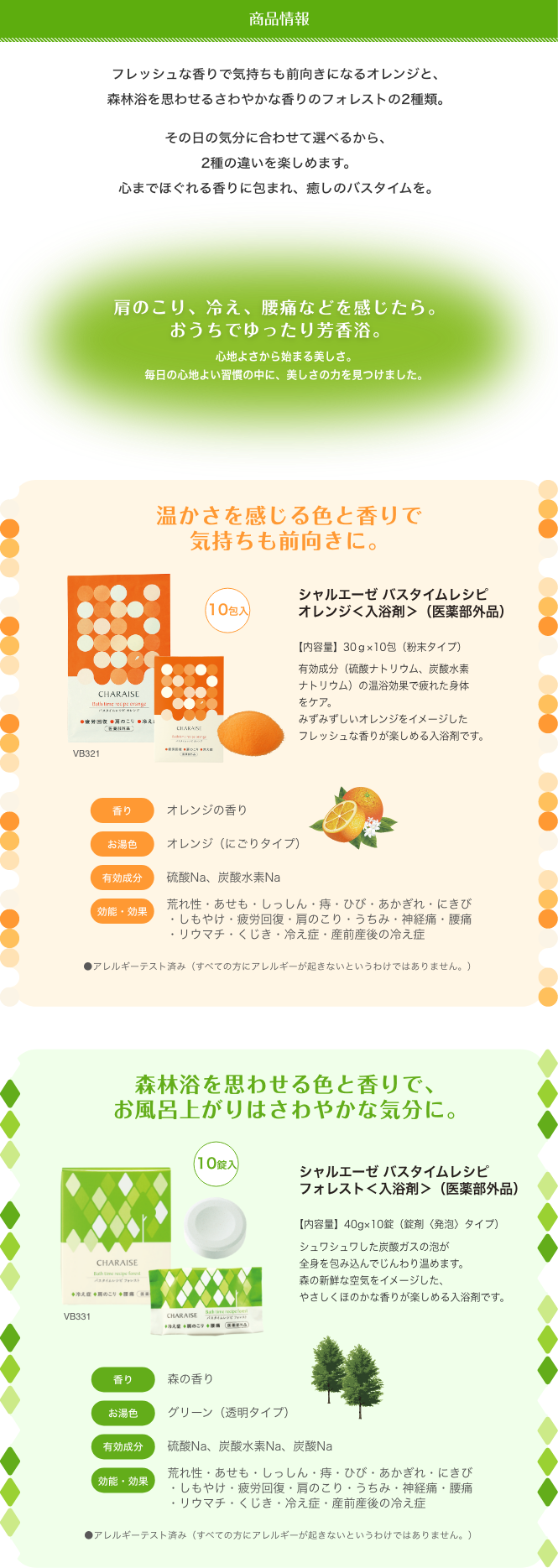 入浴時間が楽しみになる、バスタイムレシピ オレンジ/フォレスト<入浴剤>。フルーティーな香りでやすらげる粉末タイプのオレンジと、森の香りがさわやかな発泡タイプのフォレストの2種類。心までほぐれる香りに包まれ、癒しのバスタイムを。